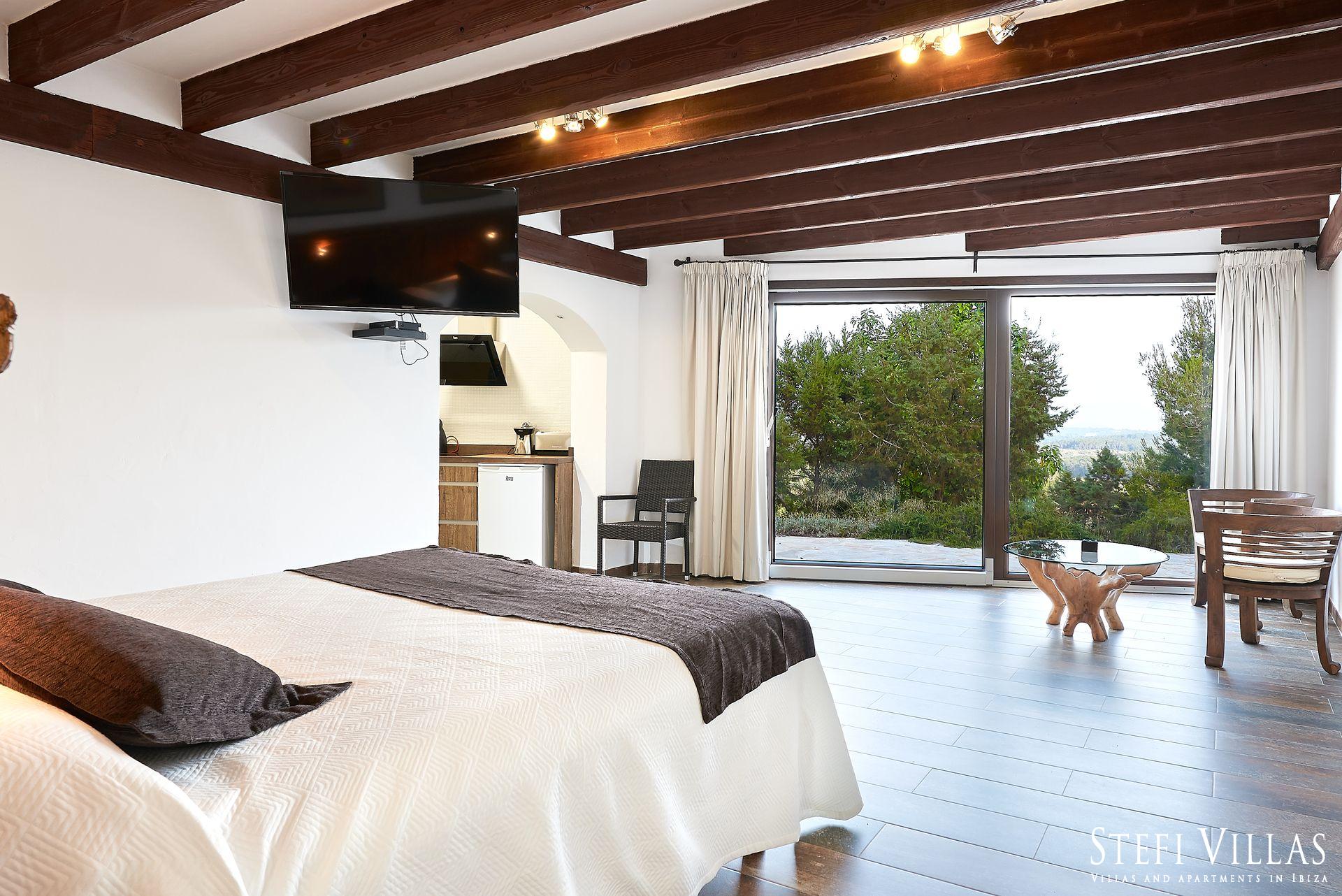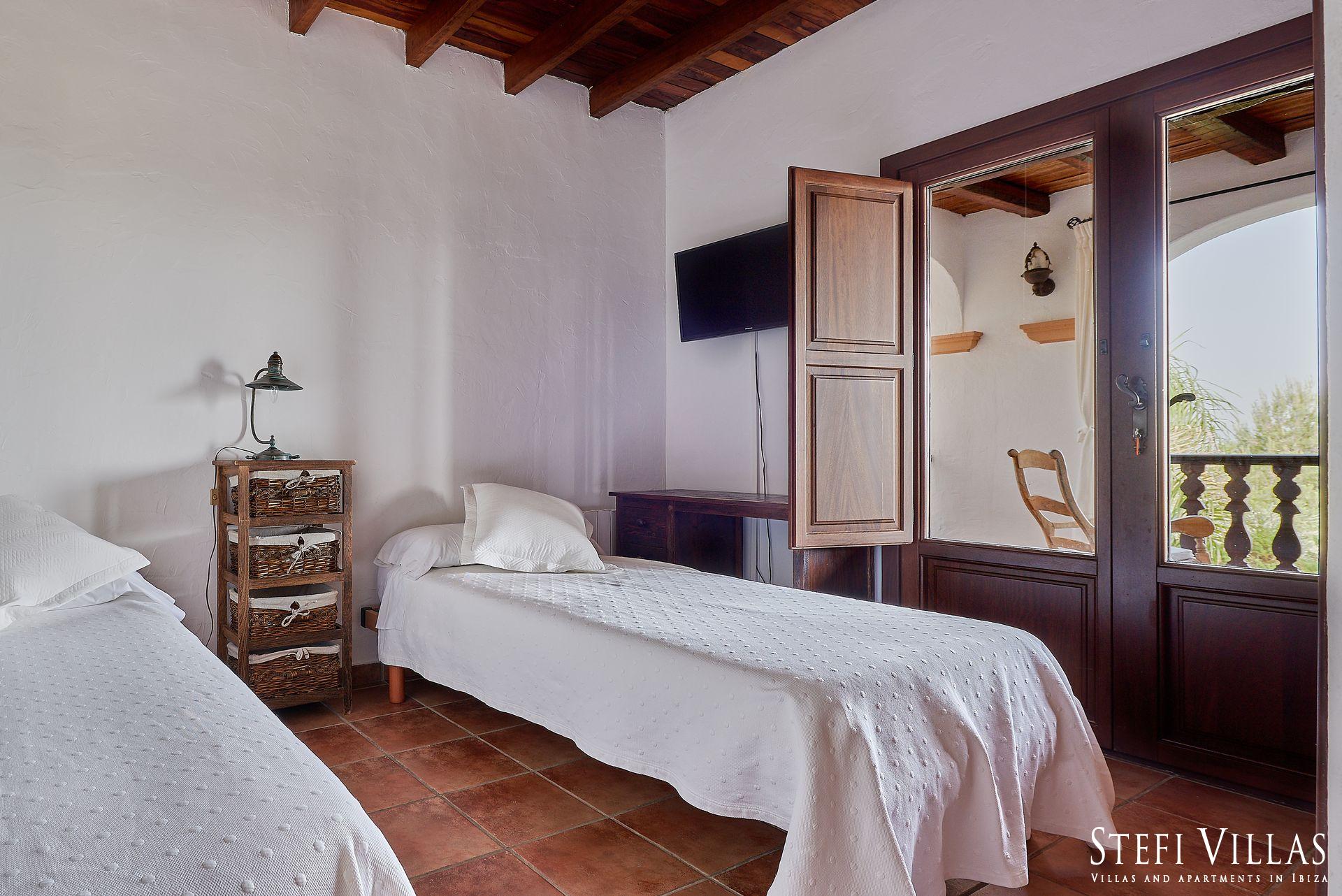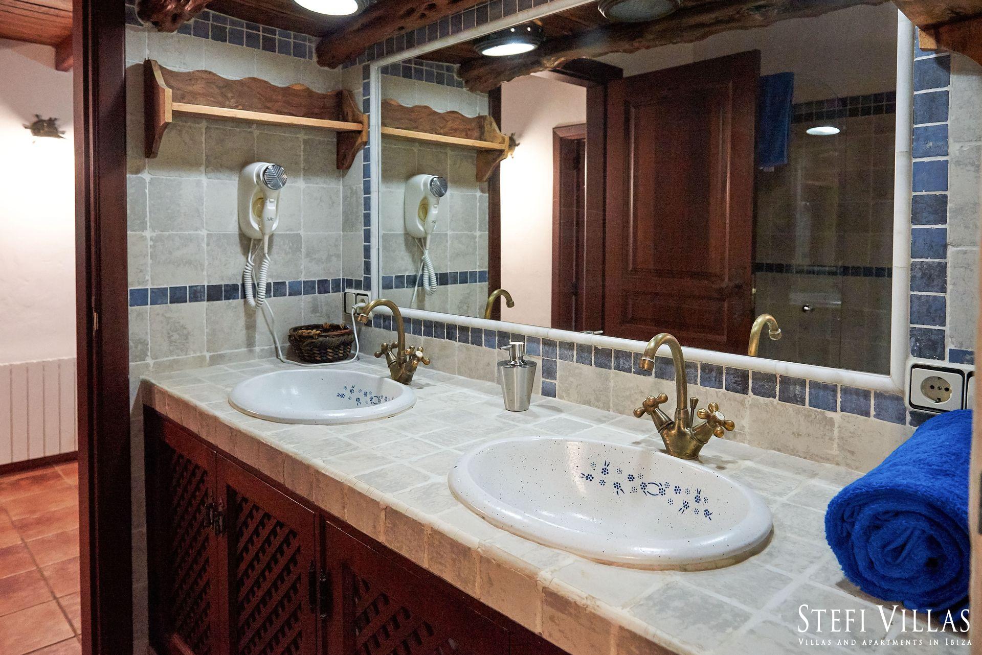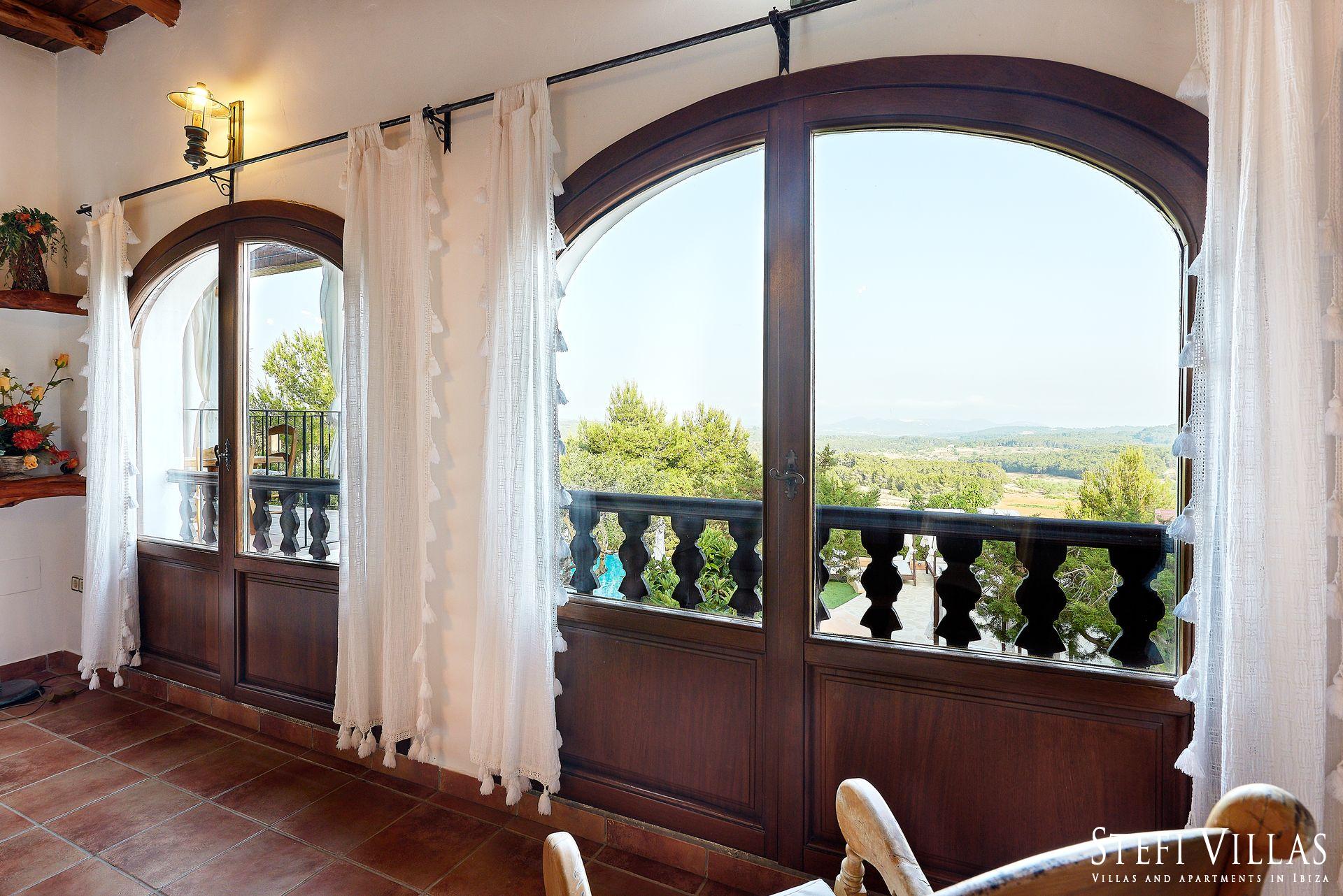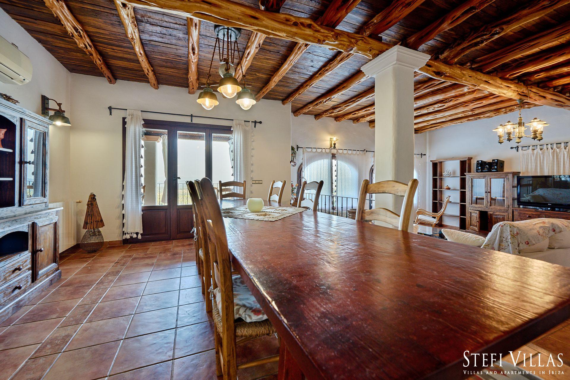 Gran casa para familias y eventos en ibiza, ubicada entre San Rafael y San Mateo, la Villa Can Beia de 350 m² tiene 2 plantas y ofrece una vista impresionante de Ibiza. La impresionante casa está en el corazón de la isla y ofrece espacio para hospedar a 12 personas, cuenta con un rústico salón-comedor, una cocina bien equipada, 6 dormitorios, con A/C un gimnasio y 7 baños.