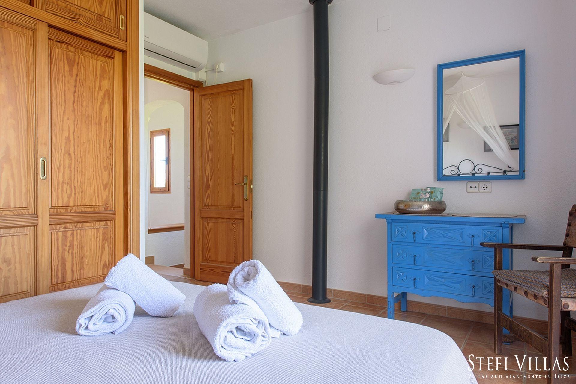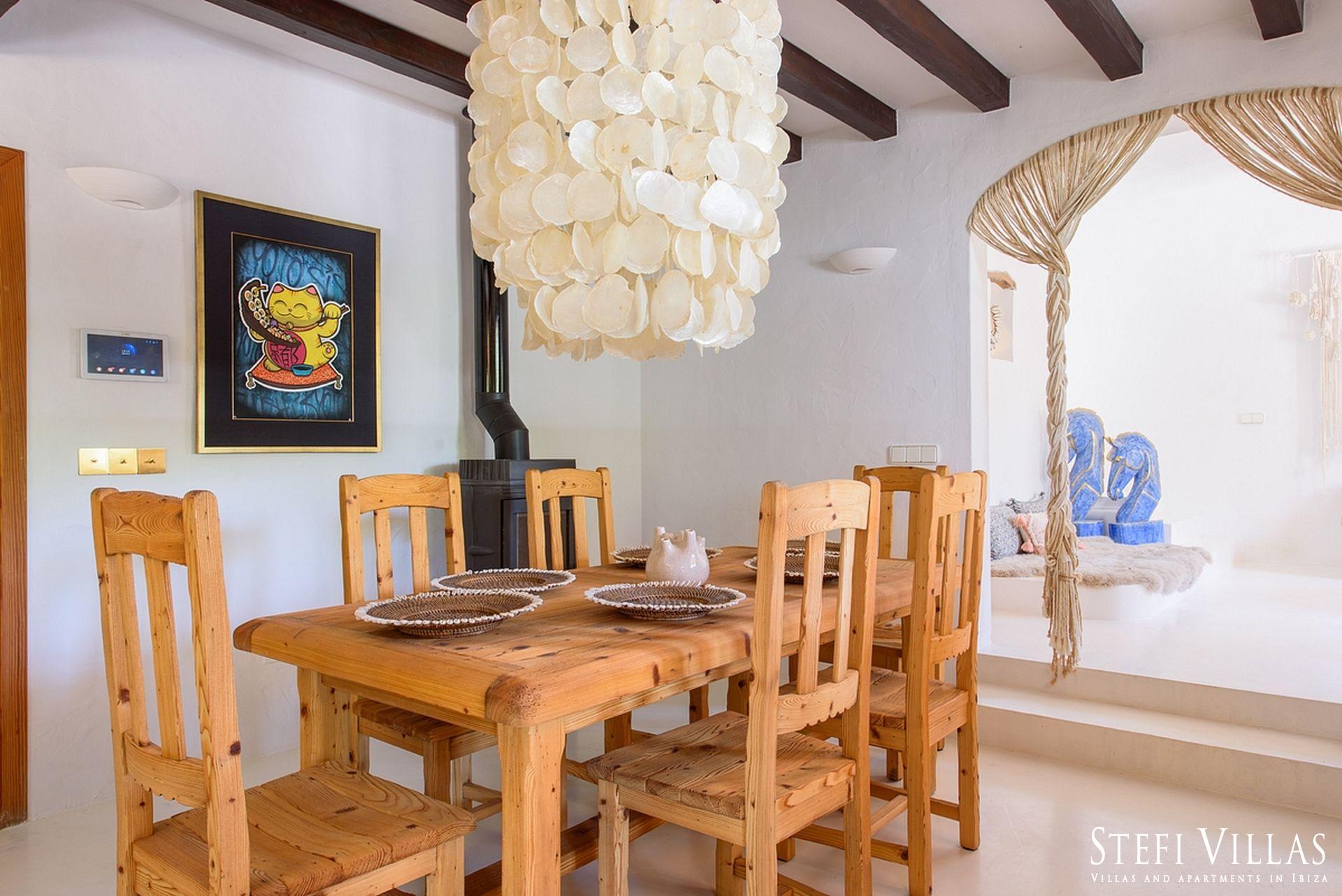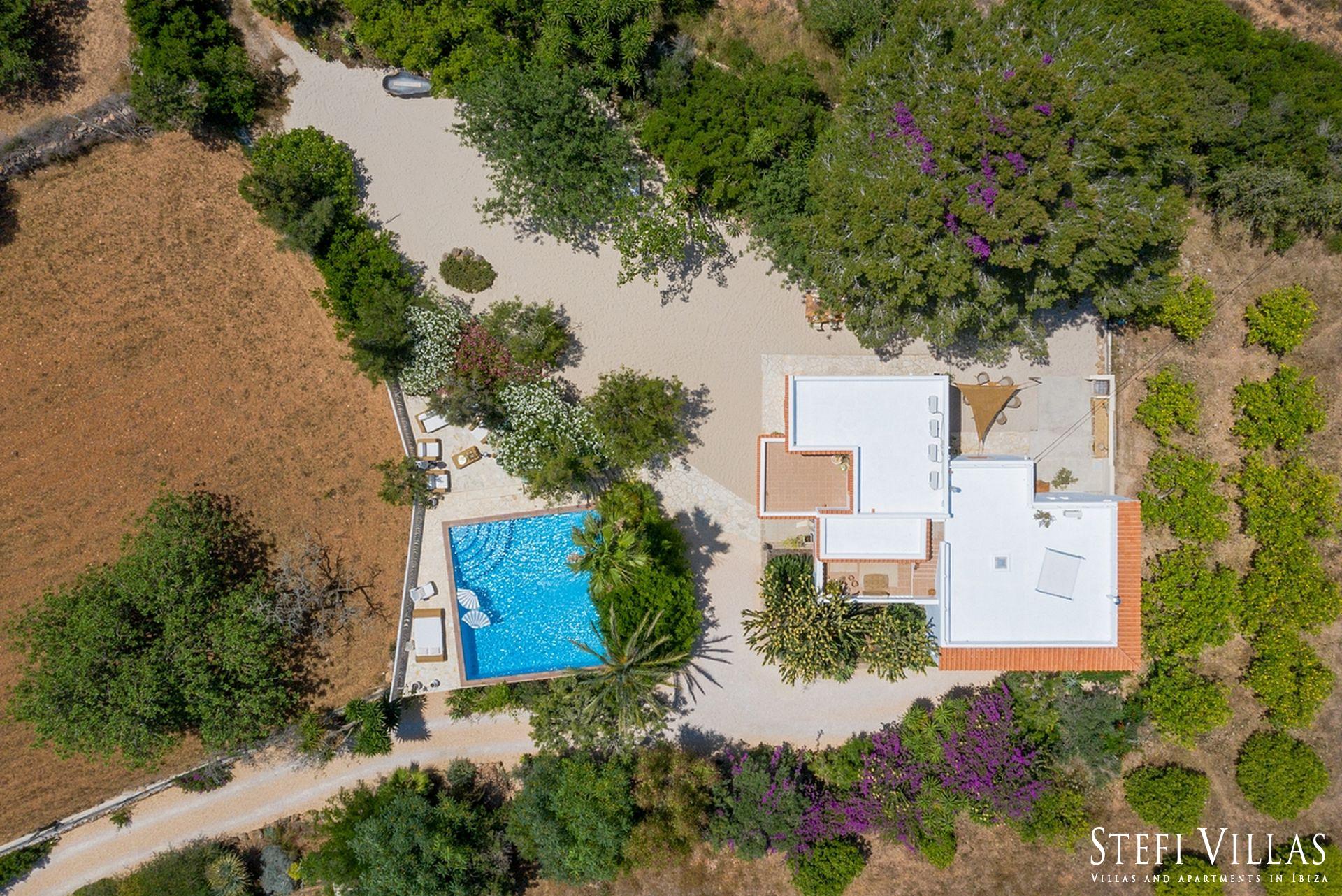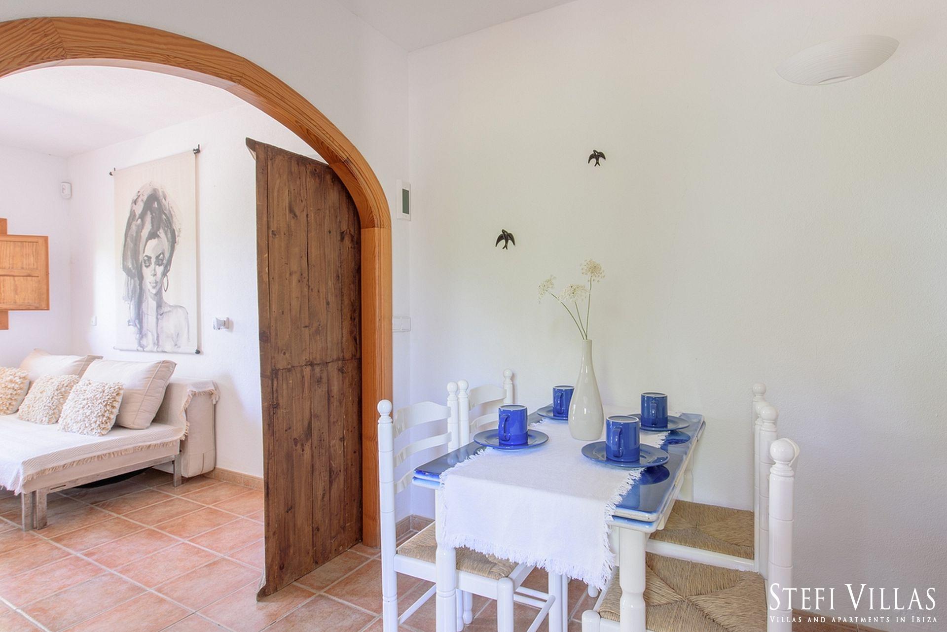 La villa se encuentra en el norte de Ibiza, a 4 km de la playa de Benirras. La casa principal cuenta con 3 dormitorios con cama doble, 2 baños, aseo, salón, terraza, comedor y cocina.