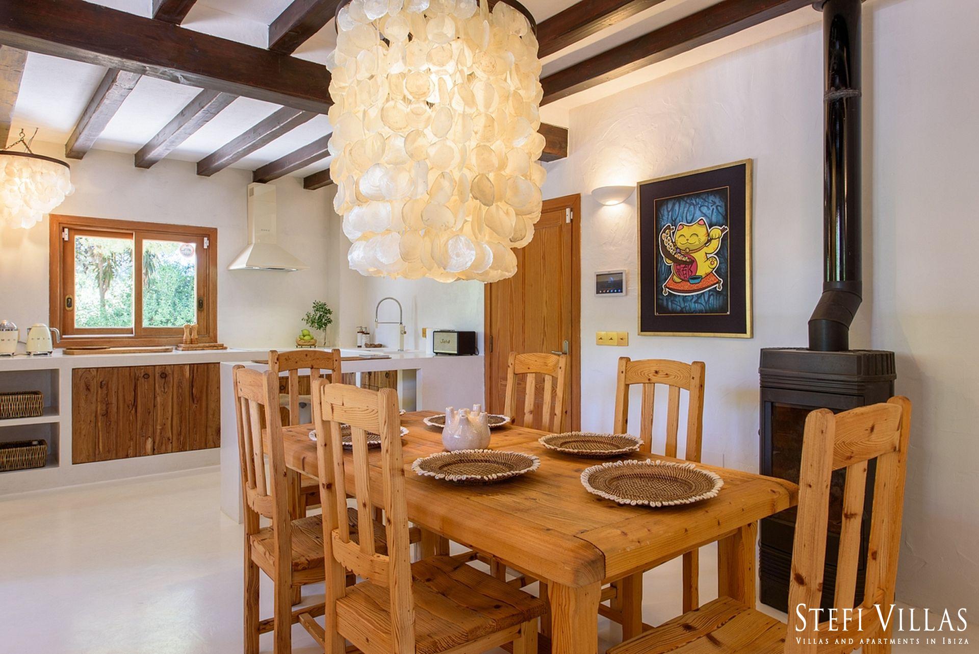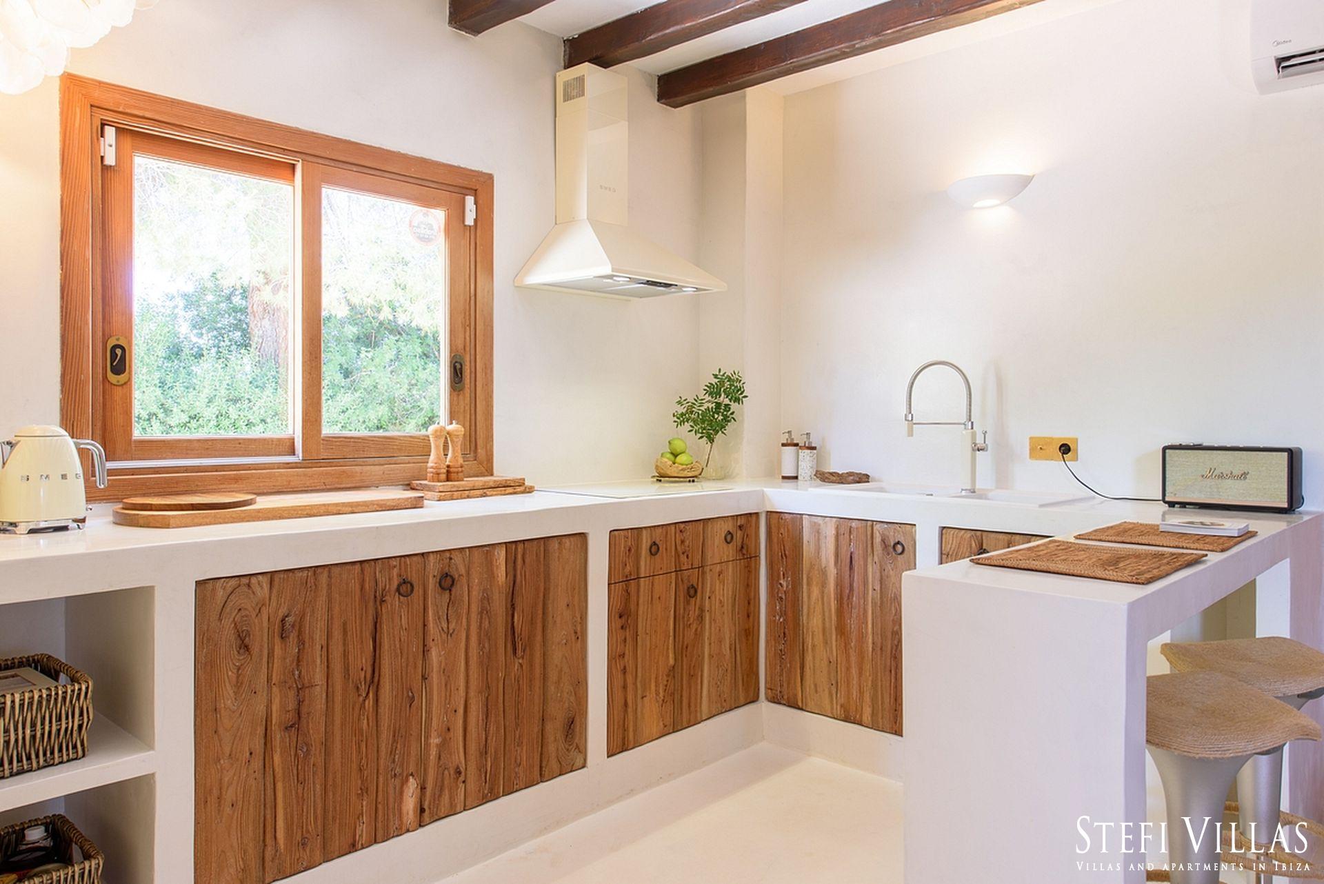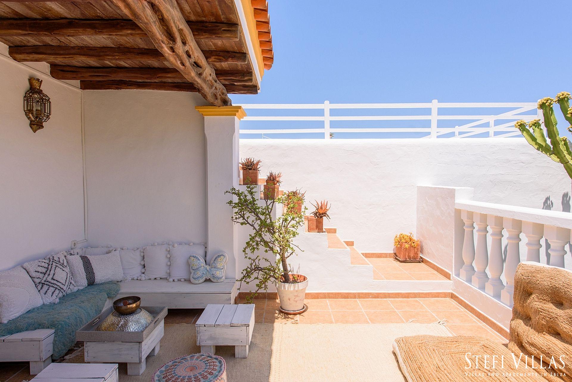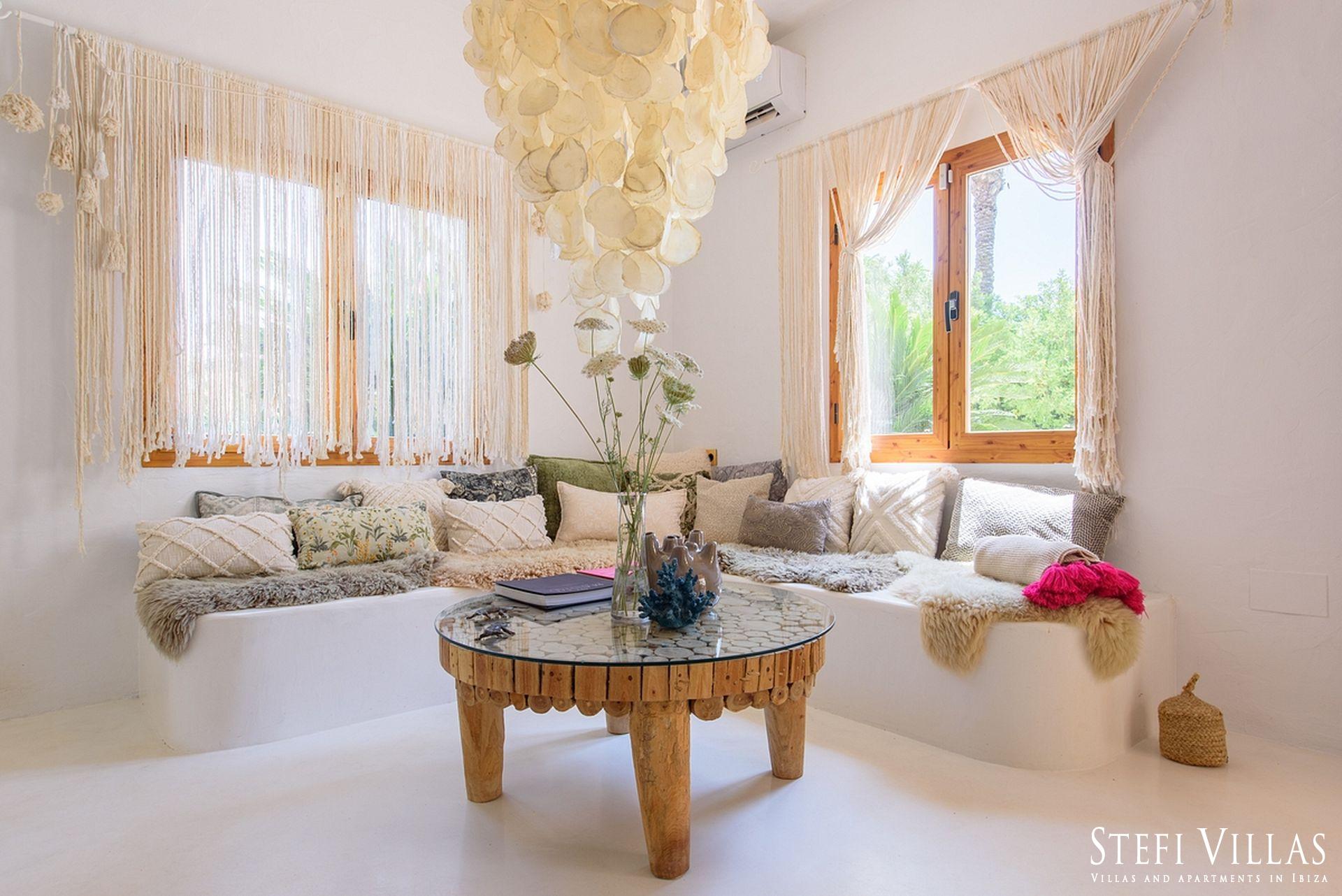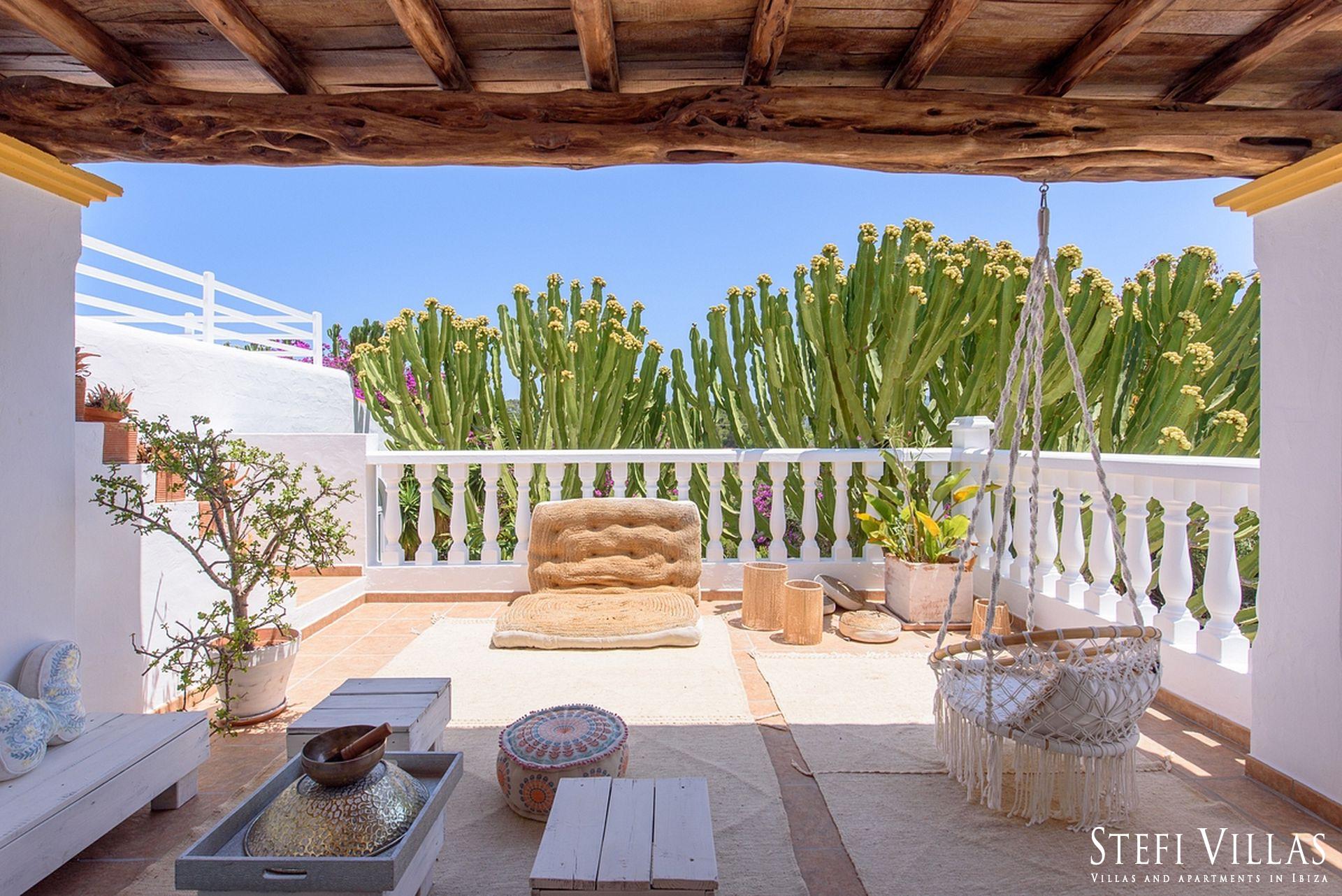 La villa se encuentra en el norte de Ibiza, a 4 km de la playa de Benirras. La casa principal cuenta con 3 dormitorios con cama doble, 2 baños, aseo, salón, terraza, comedor y cocina.