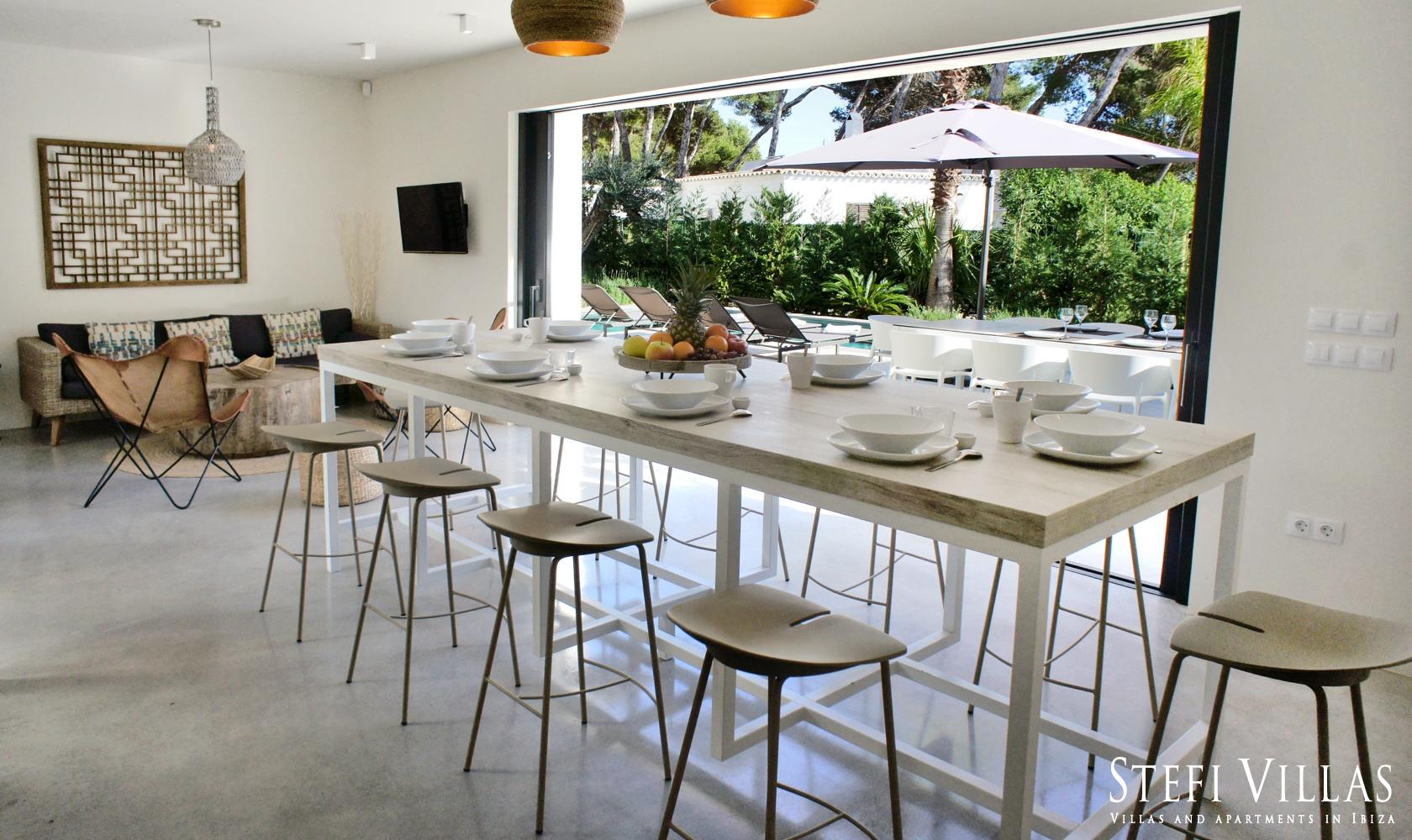 La villa dispone di un bellissimo soggiorno-sala da pranzo che si apre sulla piscina e sul giardino.