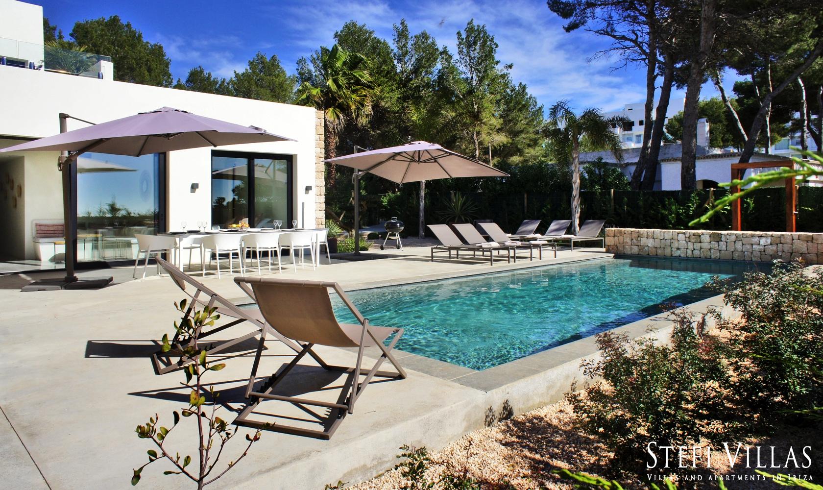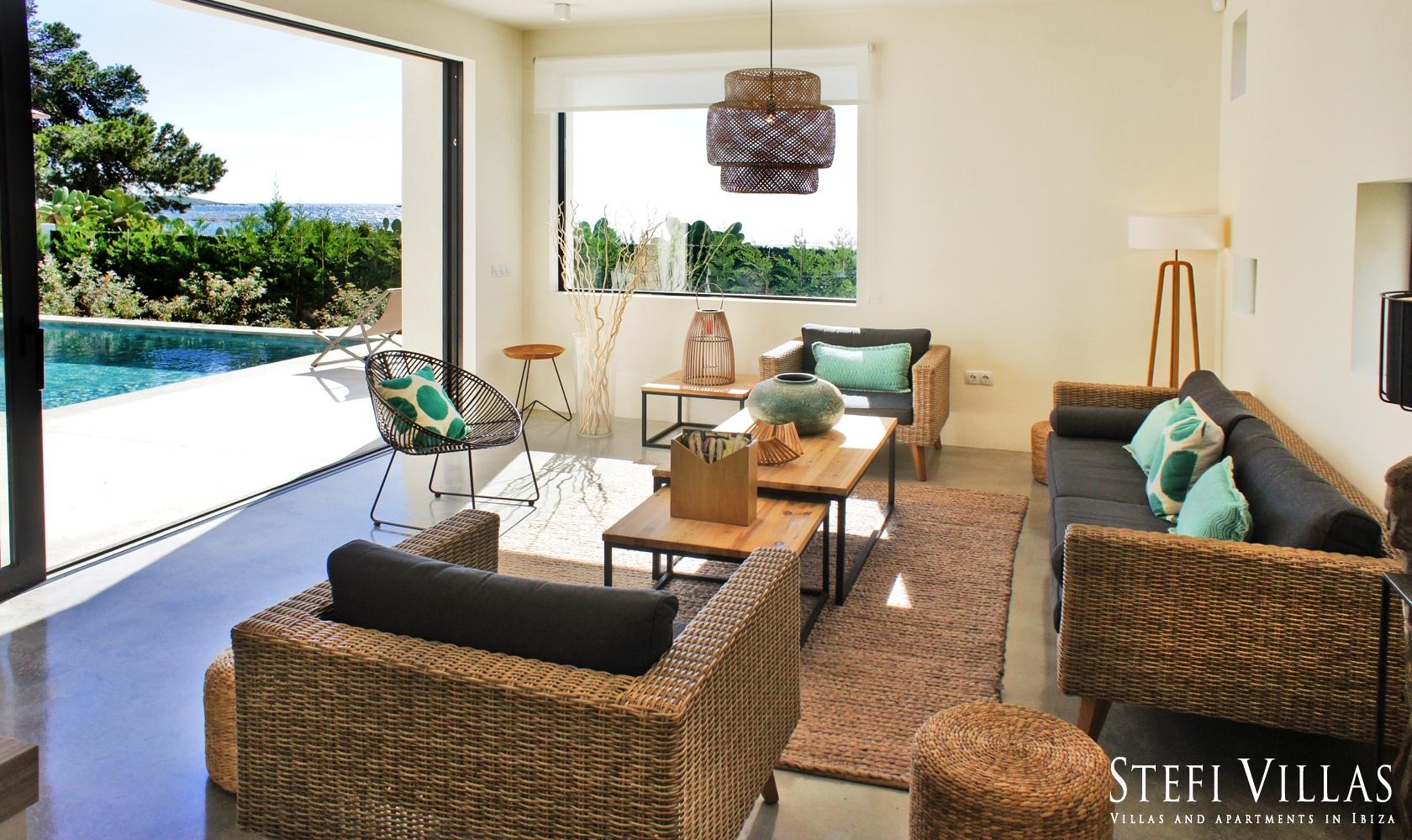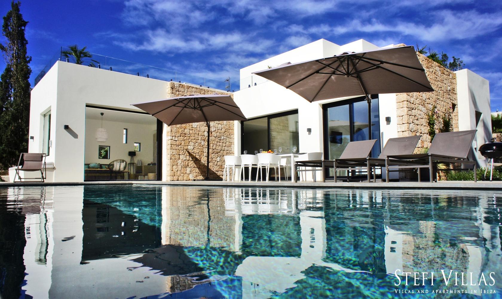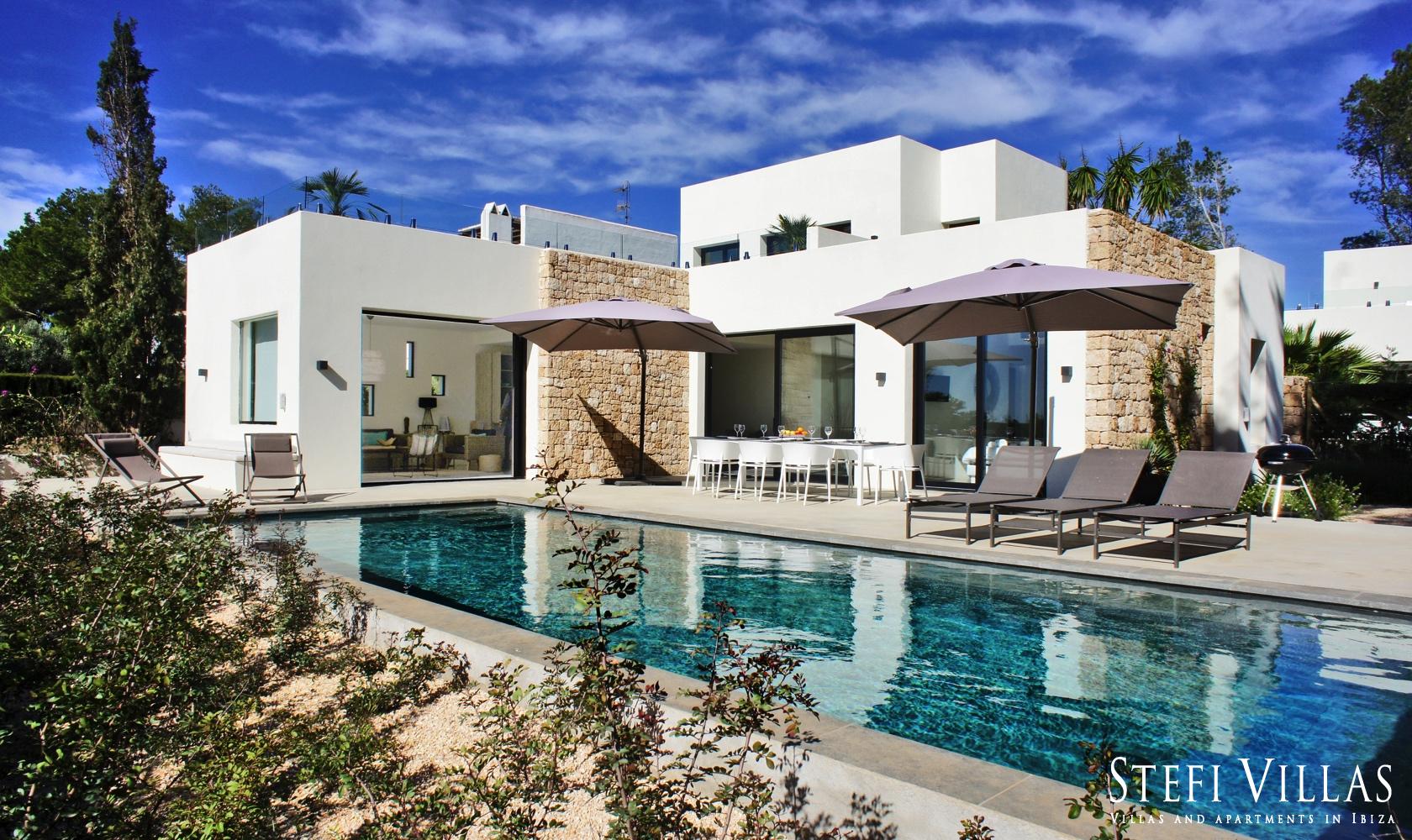 Cette magnifique villa très moderne, toute proche des plages de Cala Pada, Niu Blau et Cala Martina dans la partie Est de l’ile
